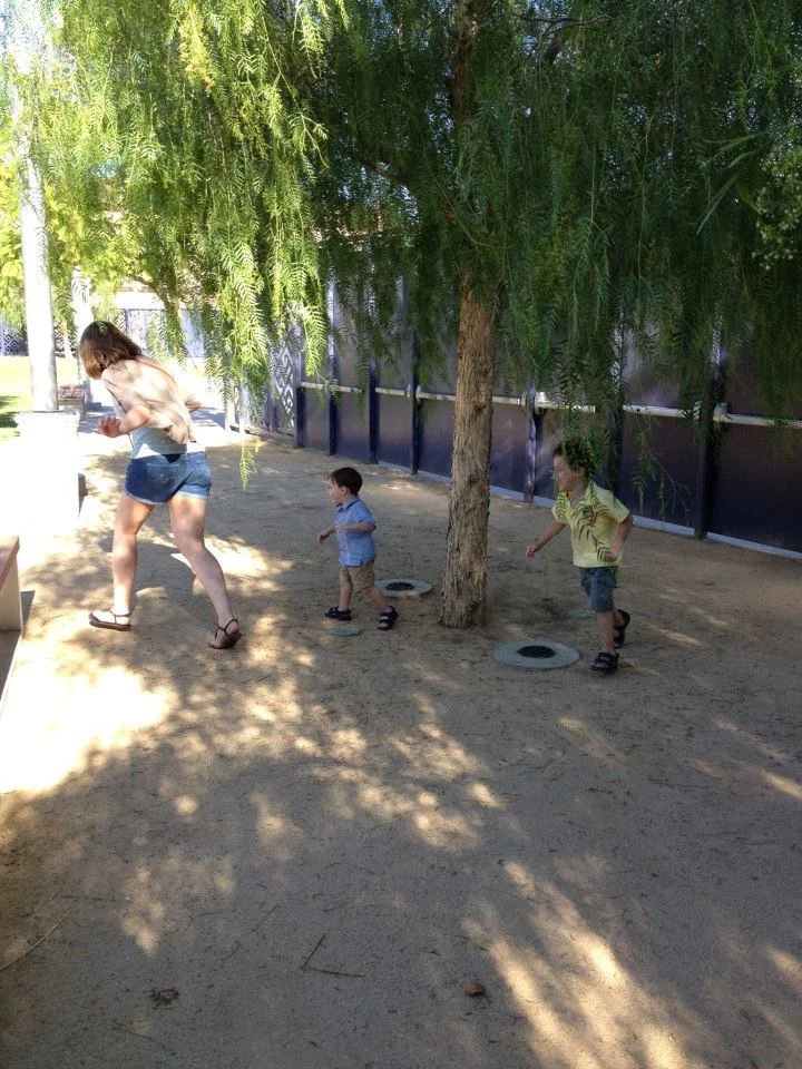 When we finished eating, we walked back the way we came until we reached a Mexican history museum, La Plaza de Culturas Y Artes. Kevin and Dominic chased me around its lawn, and Kelly told us how much Kevin loved the brooms on the children's floor.