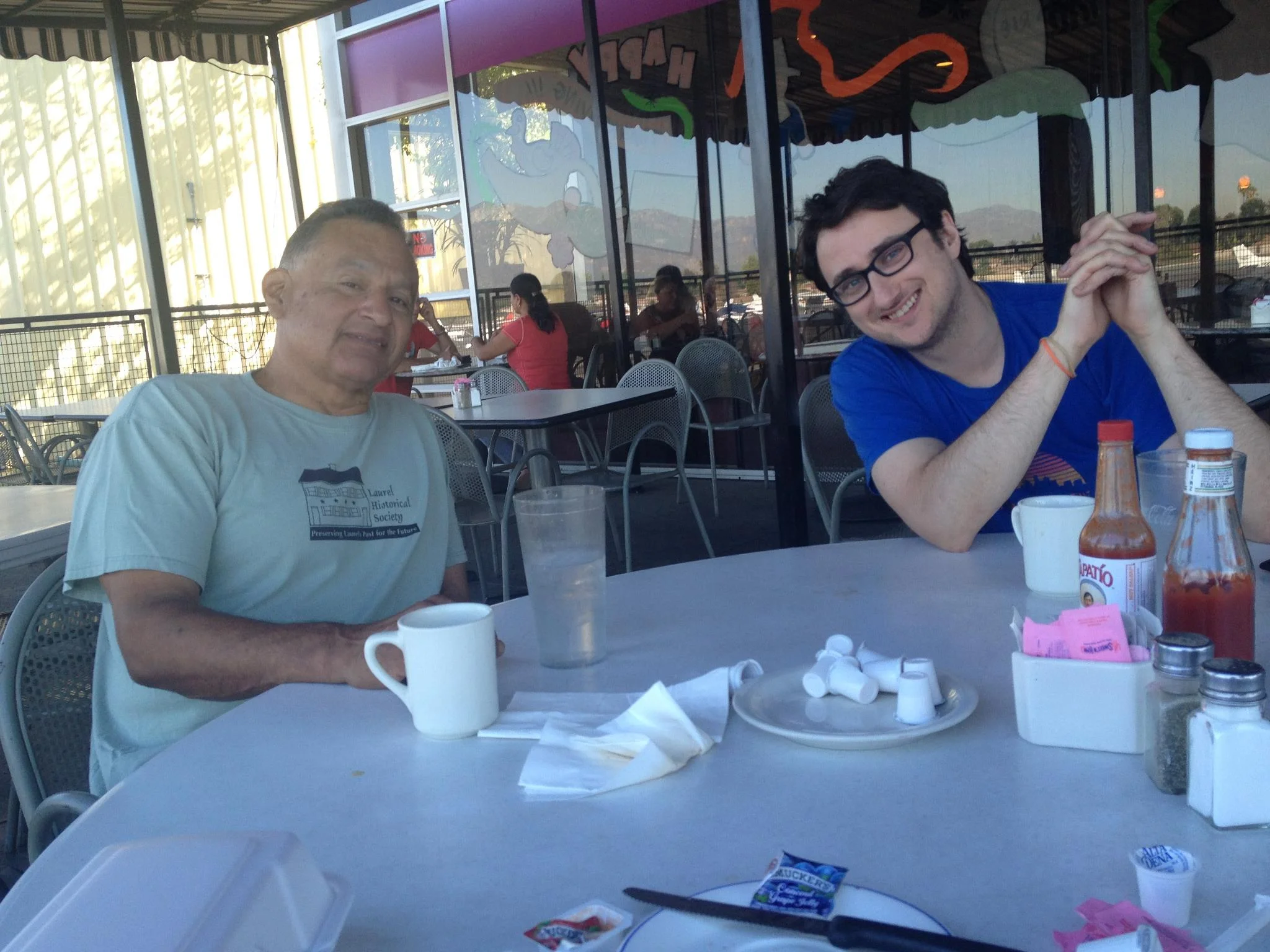 The next day we were on our own again, but this time with a knowledgeable guide. Papa John—what the Solises call John's father to differentiate the two—took us to Norm's by the private airfield in La Verne for brunch, which turned out to be a breakfast burrito as wide as my head. Papa John and Steven then started a conversation that never ended. Every male Solis relates to Steven this way. After brunch, Papa John kept talking about a place called Watts that he wanted us to see. He phrased it more like a challenge than a suggestion. He seemed to think we'd be too afraid to go there, but I had no idea why.