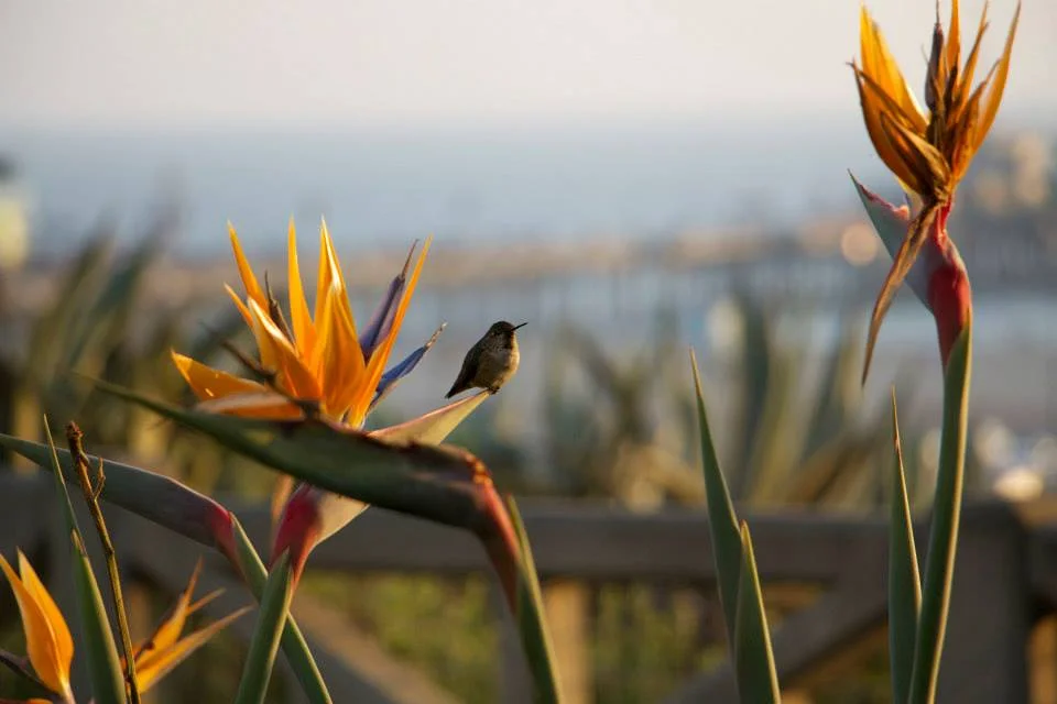 Hummingbird and birds of paradise in Santa Monica (photo by Steven Seighman)