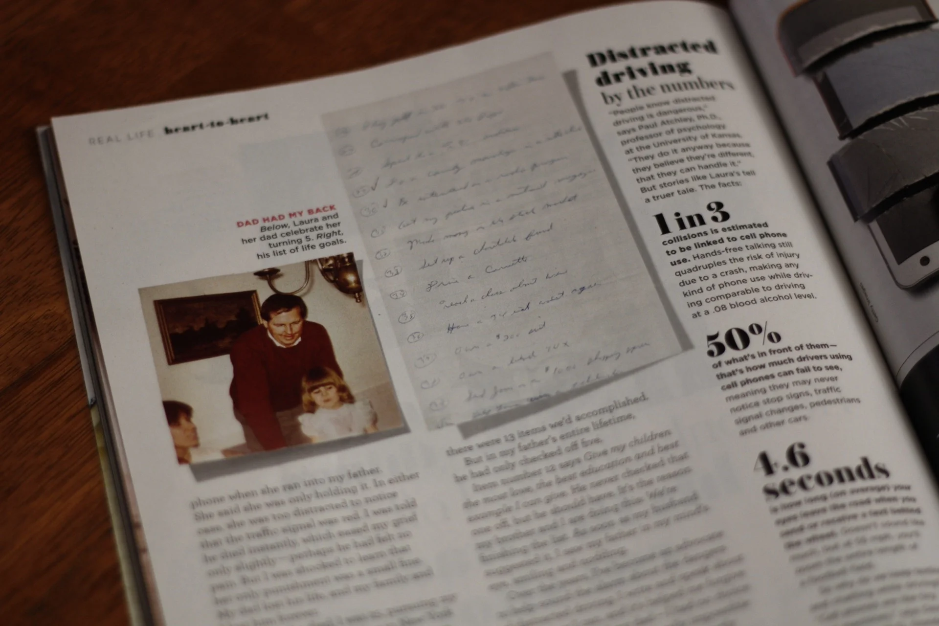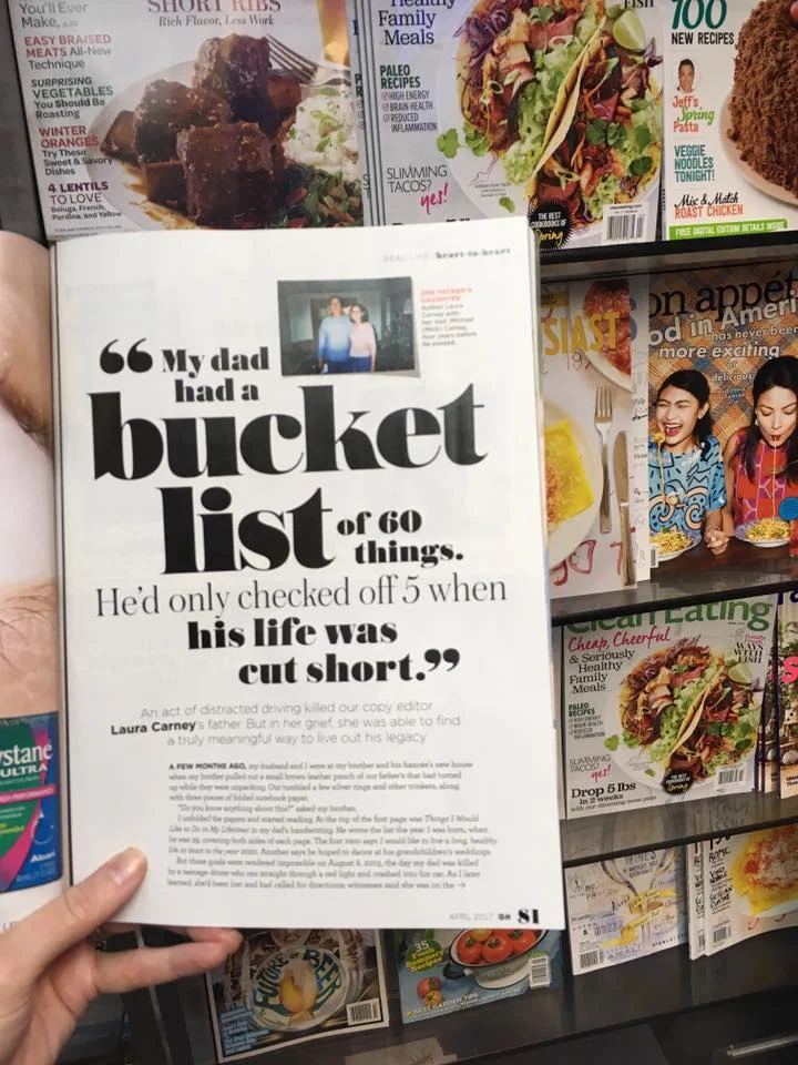 About two months later, Carla emailed me asking if I'd be interested in writing a personal essay to go with the distracted driving story in GH. I said sure, and by the way, my brother just found what appears to be our dad's bucket list. Then, in January 2017, I showed her this website, and she said, "That's it. That's the essay." When her editor read my first blog post, she decided to make my essay the central focus of the GH story and the investigative reporting done by the outside writer they'd hired the sidebar.