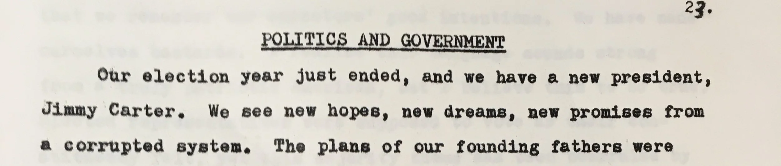 I found these lines in the chapter "Politics and Government”: "Our election year just ended, and we have a new president, Jimmy Carter. We see new hopes, new dreams, new promises from a corrupted system."
